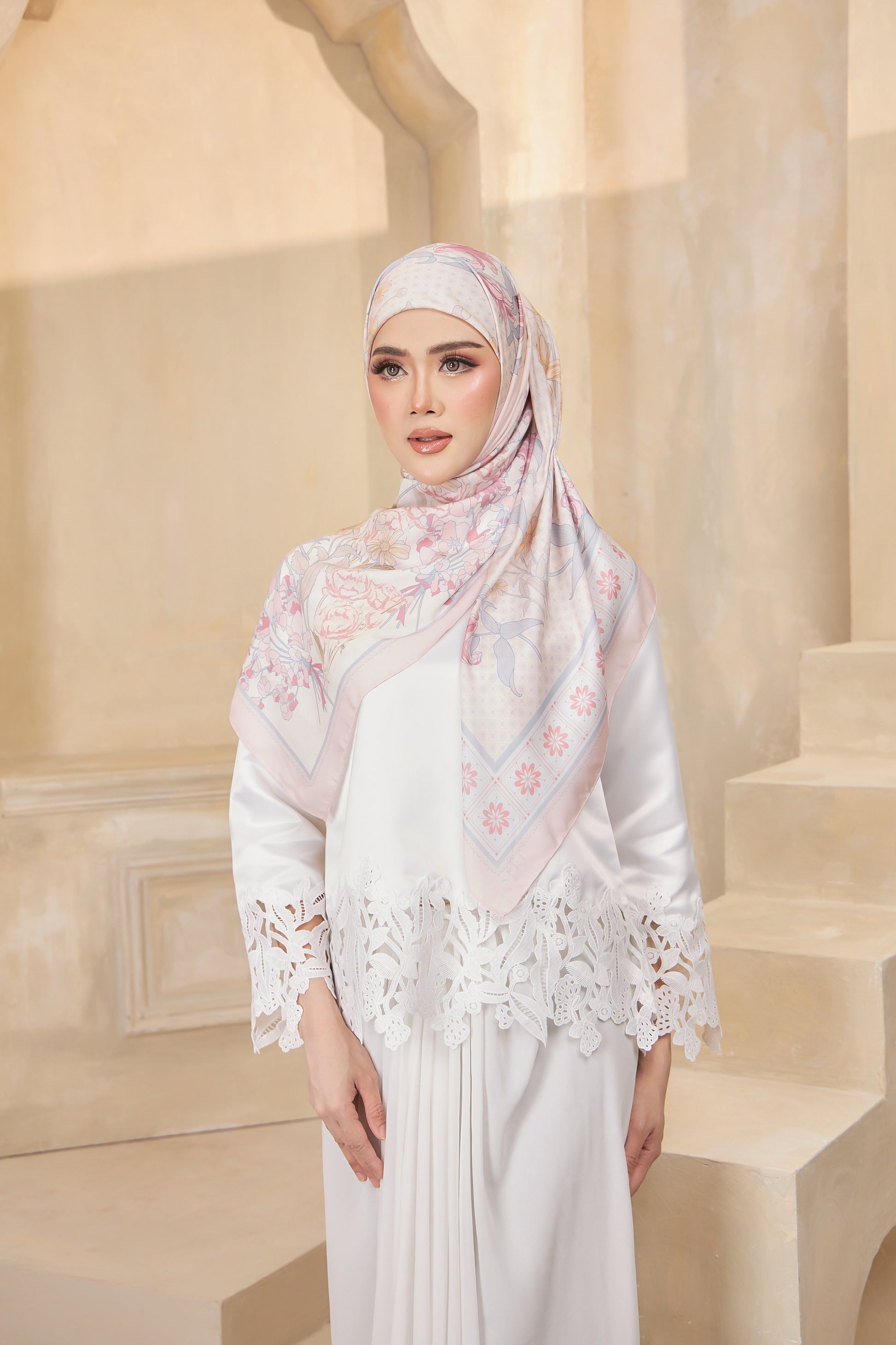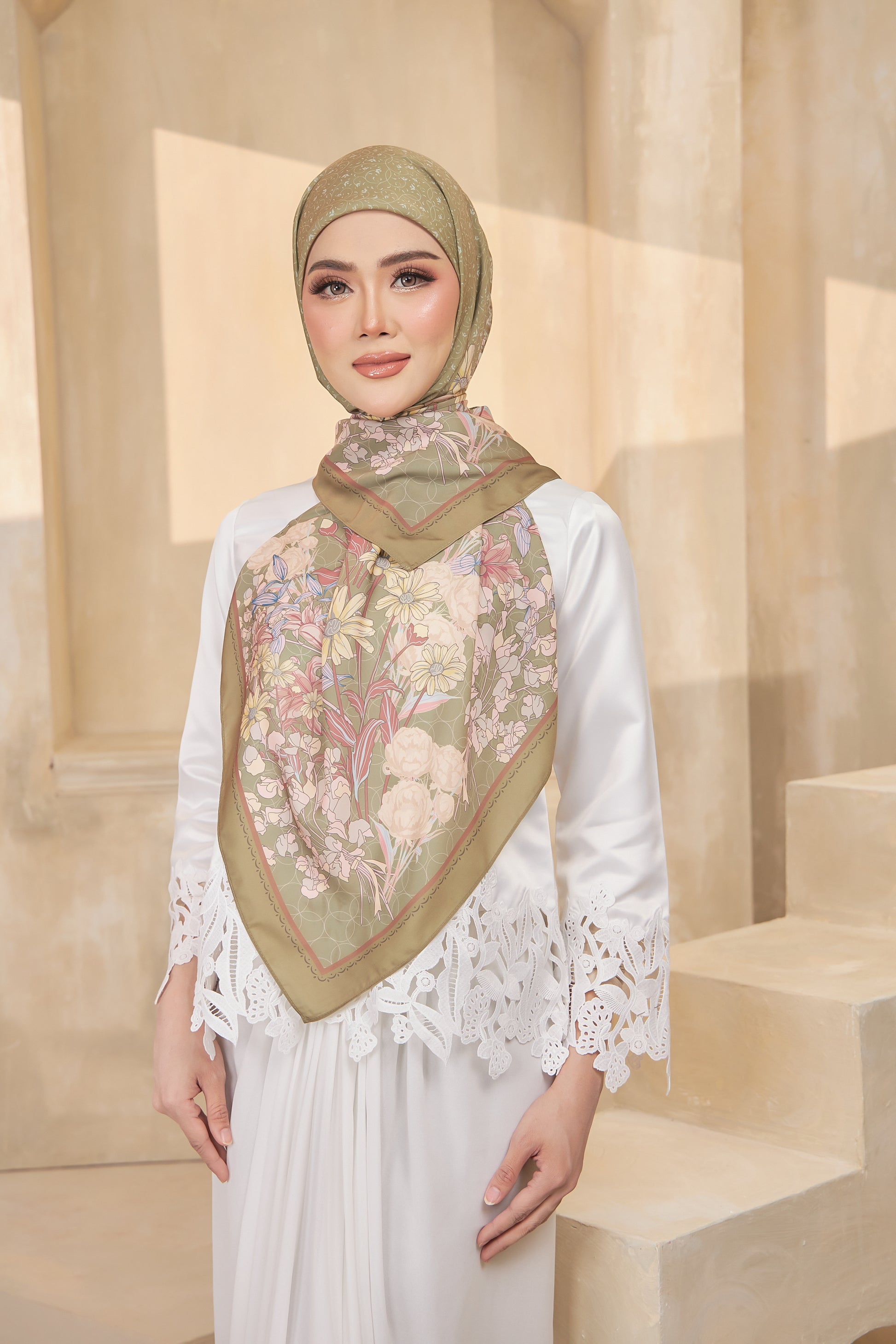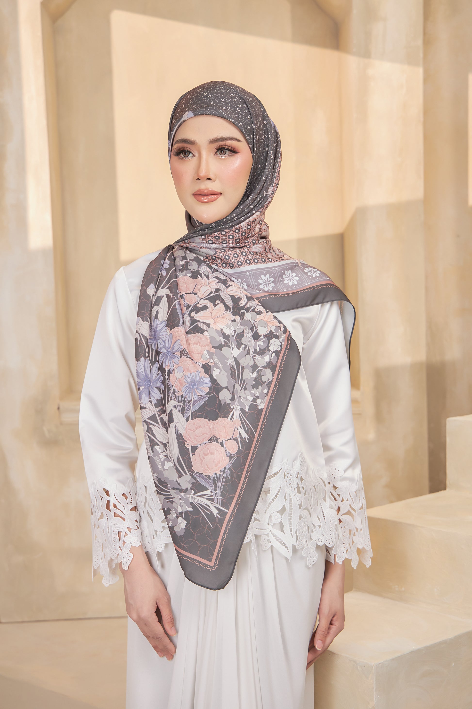 Mekar Collection features elegant satin scarves crafted with delicate motifs and a soft, lustrous finish.
